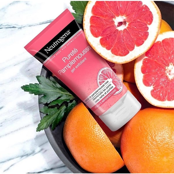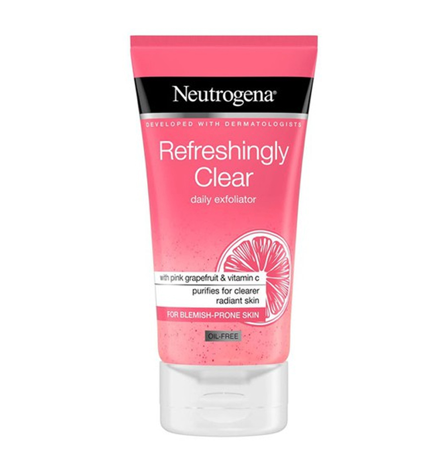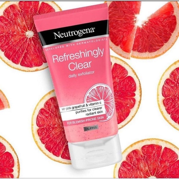 Neutrogena Refreshingly Clear Daily Exfoliator With Grape-Fruit & Vitamin-C chiết xuất từ bưởi hồng với công nghệ làm sạch Microclear giúp làm sạch mụn đầu đen và vết thâm mà không làm khô da. Thích hợp cả với làn da nhạy cảm.