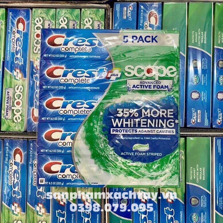 Kem đánh răng Crest Complete + Scope Advanced Active Foam có những lợi ích của kem đánh răng Crest với việc bổ sung độ tươi mát Scope. Tiêu diệt 99,9% vi khuẩn gây hôi miệng, làm trắng nhiều hơn 35% và chứa nhiều hơn 30% Scope Active Foam hàng ngày mang lại cho bạn hơi thở thơm mát và sảng khoái.
