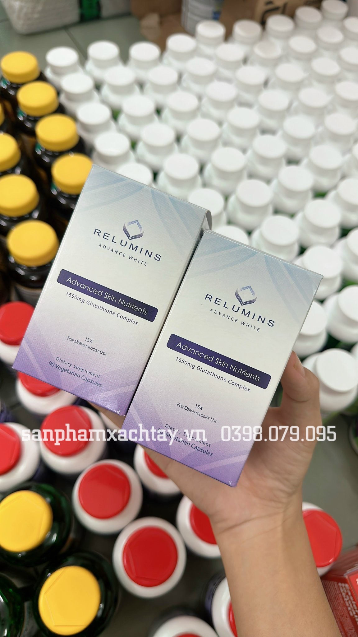 - Vên uống trắng da relumins advance white giúp bổ sung glutathione nhằm cải thiện sức khỏe cho cơ thể nhất là da, tóc và móng tay mang đến cho bạn một làn da trắng sáng và khỏe mạnh và giải độc tố cho cơ thể.