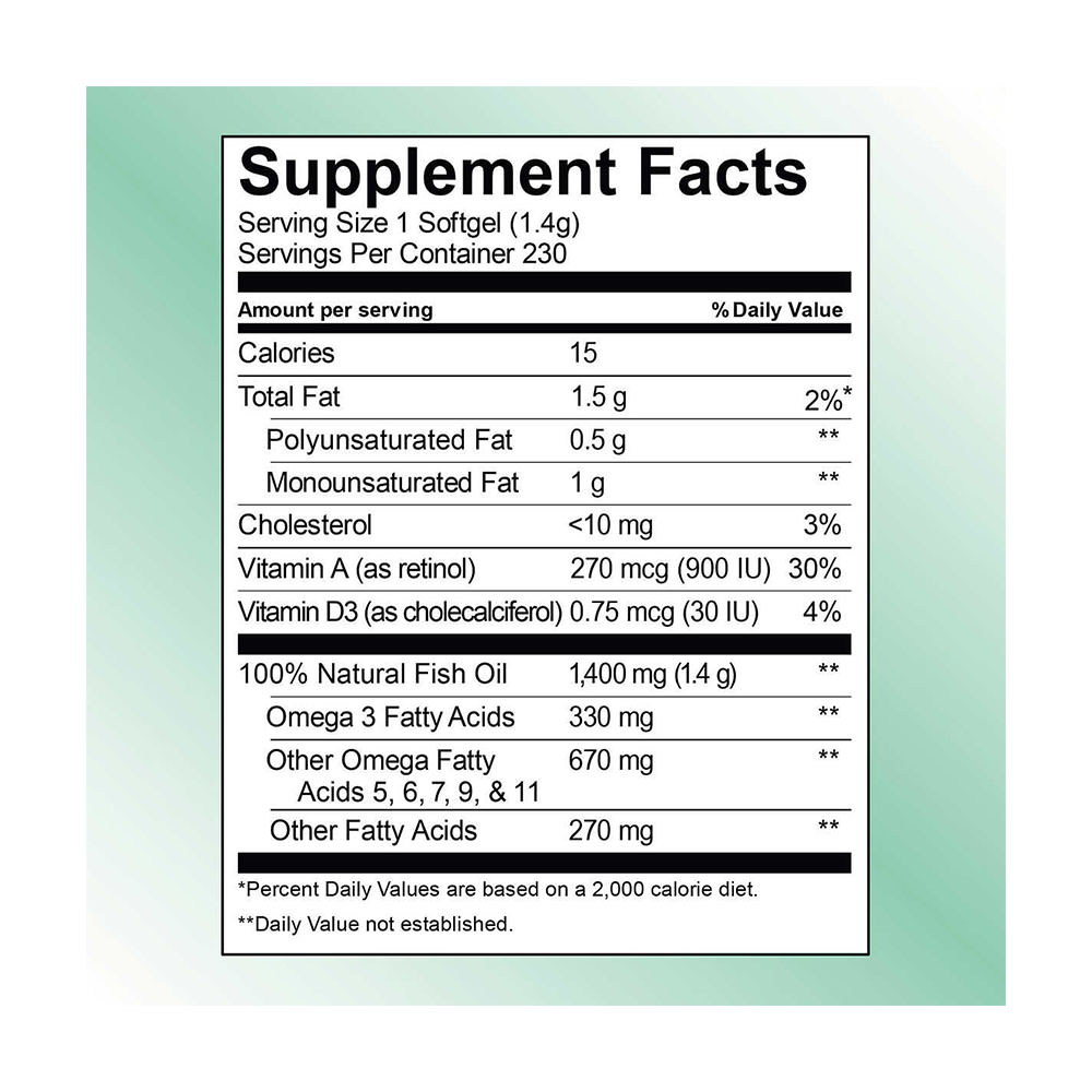 - Thành phần khác: Wild Alaskan Fish Oil (As Naturally Formed Triglycerides); Gelatin (Bovine), Water, Glycerin, Vitamin E (as a mixed Tocopherol, as an antioxidant).