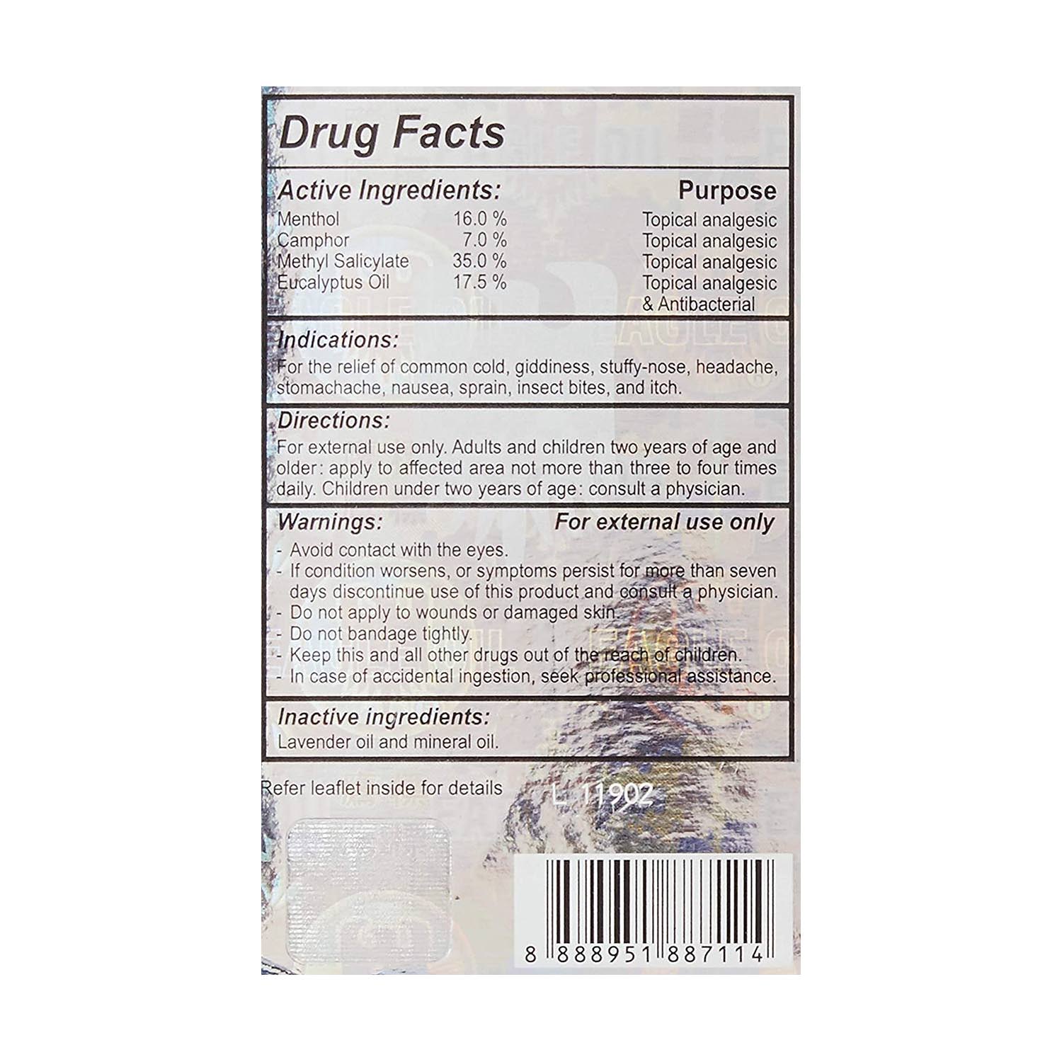 Eagle Brand được biết đến qua nhiều thế hệ, sản phẩm có mùi thơm độc đáo dịu nhẹ, nhanh chóng giảm nhức đầu và cảm lạnh. Với chất lượng cao, Eagle Brand hứa hẹn chỉ cung cấp những thành phần tốt nhất trong công thức đặc biệt, các tính chất điều trị được chiết xuất từ tinh dầu bạch đàn và tinh dầu oải hương. Sản xuất tại Singapore, dầu gió trắng nhãn hiệu Eagle đã tồn tại trong hơn 50 năm, với nhiều công dụng hữu ích.