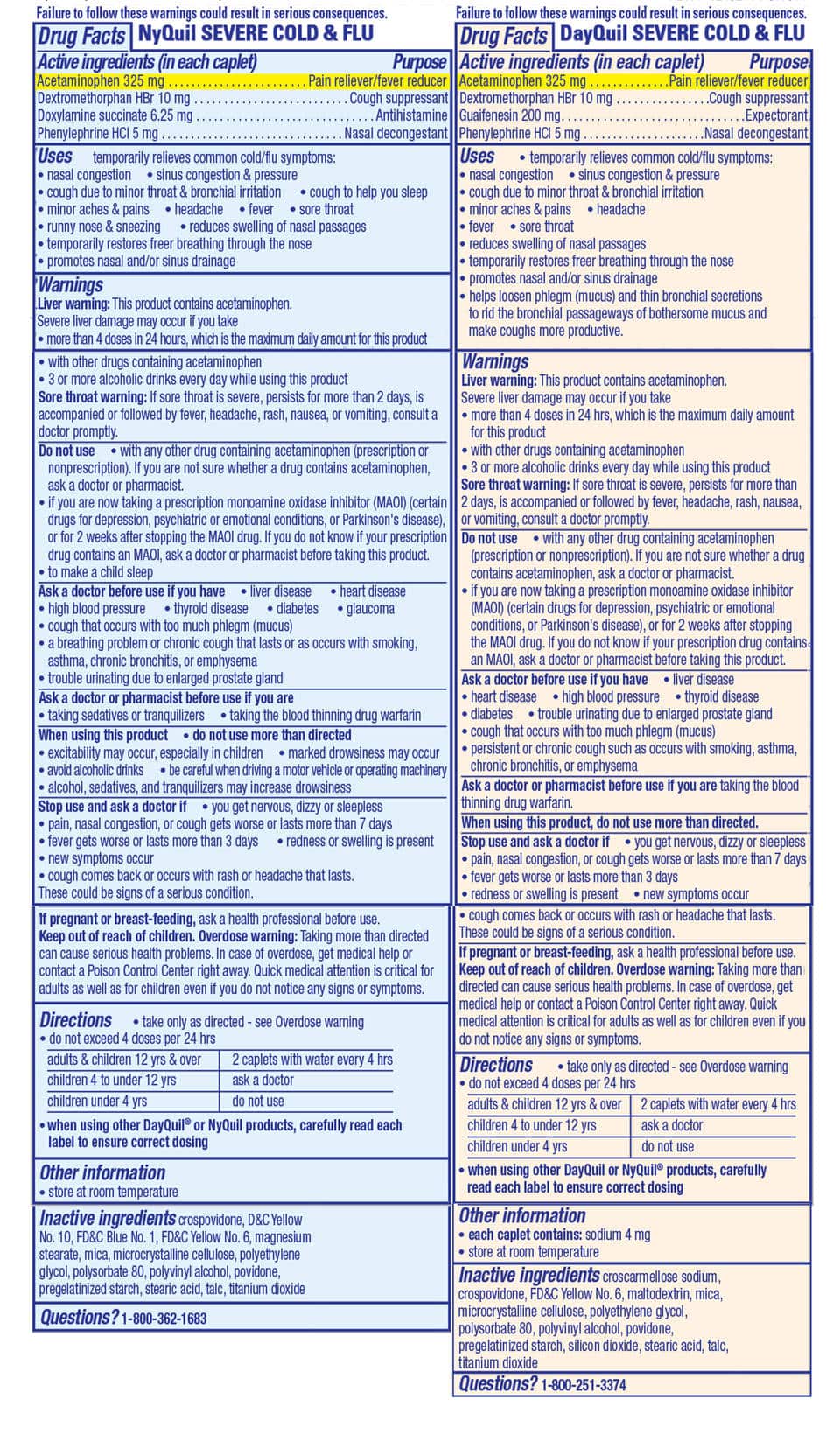 Thành phần viên uống ho, cảm cúm Vicks DayQuil & Nyquil Severe Cold & Flu Relief ngày và đêm