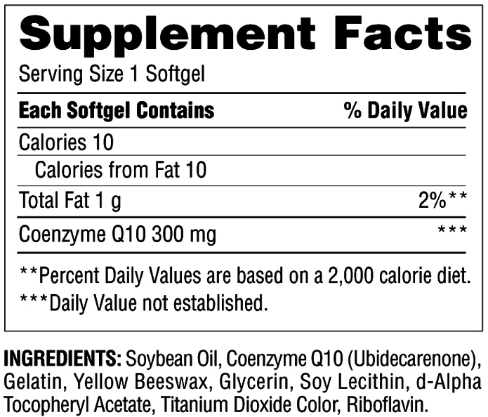 Coenzyme Q10,Soybean Oil, Gelatin (non-bovine), Glycerin, Water, Soy Lecithin, Beta Carotene (artificial color).Không có hương vị nhân tạo, không chất bảo quản.