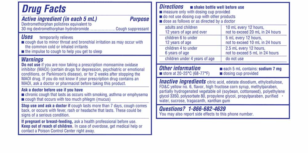 Siro giảm ho Delsym® 12-Hour Cough Relief chứa dextromethorphan polisterex, tương đương với 30 miligam dextromethorphan HBr, một loại giảm ho giải phóng thời gian được cấp bằng sáng chế.