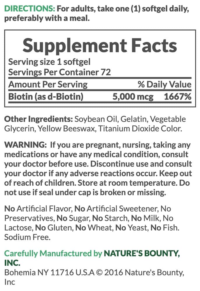Viên uống đẹp da, móng, tóc Nature’s Bounty Biotin 5000mcg từ thực vật nên nó cũng thích hợp cho người ăn chay. Sản phẩm không có màu hoặc hương vị nhân tạo, chất bảo quản, đường, sữa, lactose, đậu nành, gluten, men, cá. Không chứa natri.