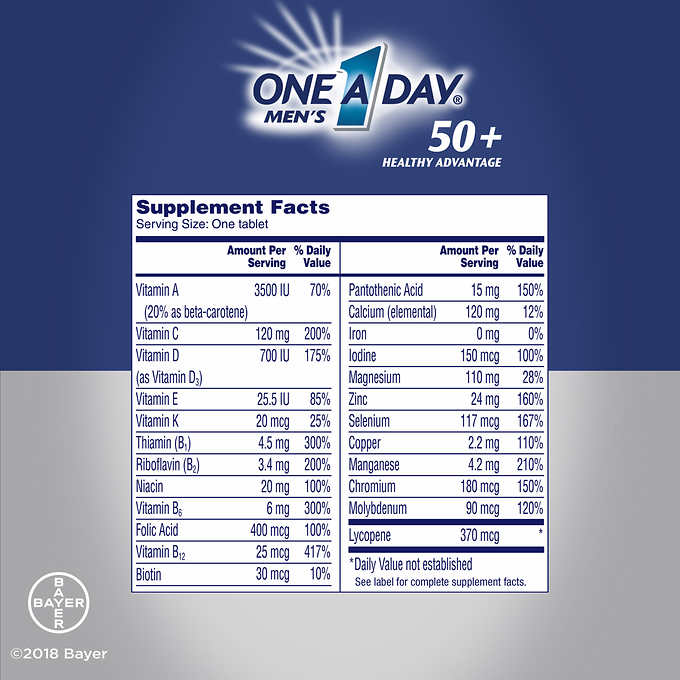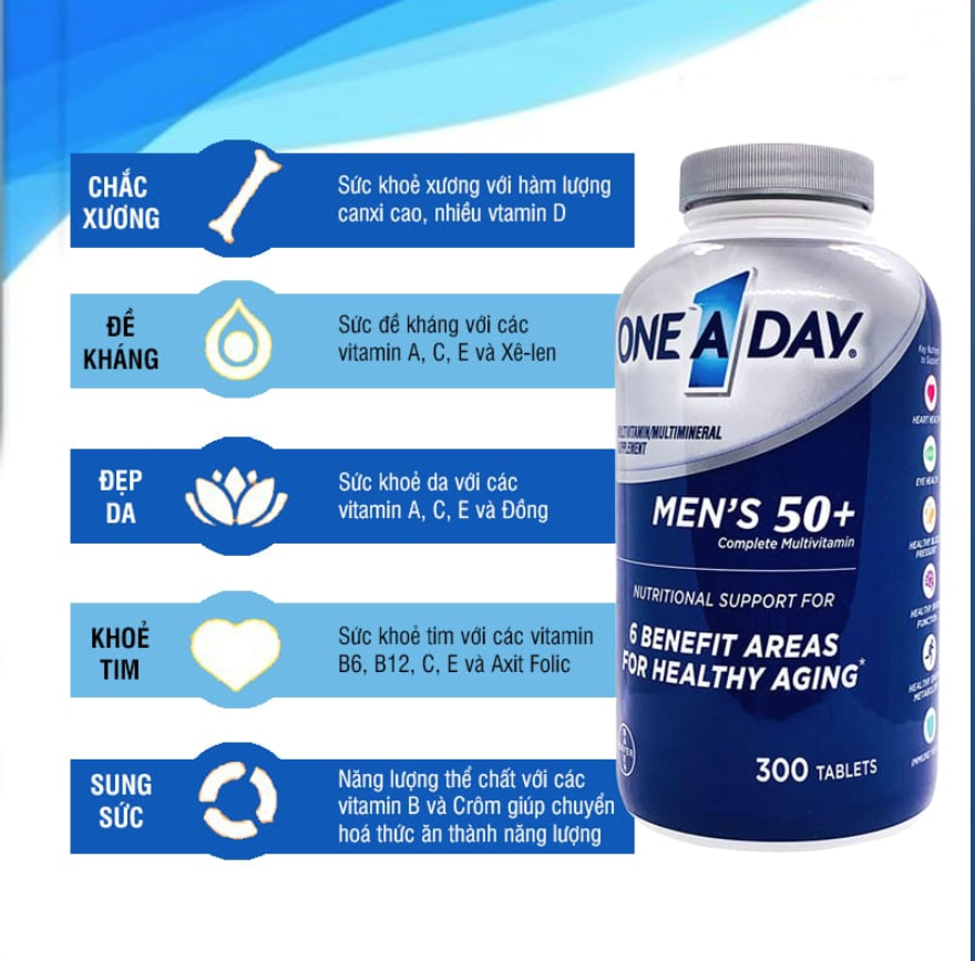 ➤ Nghiên cứu chứng minh rằng, sau 50, nguy cơ mắc bệnh về tim mạch, đột quỵ, suy giảm trí nhớ, suy giảm thị lực, giảm chức năng sinh lý,... ở nam giới là rất cao. Chính vì vậy, bạn cần kết hợp chế độ ăn uống và nghỉ ngơi hợp lý, đồng thời bổ sung thêm One A Day Men's 50+ để giúp tăng cường sức khỏe, phòng ngừa các bệnh thường gặp sau độ tuổi 50 nhé.