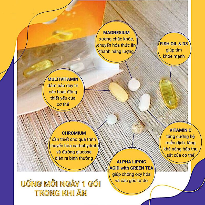 ✔ Vitamin tổng hợp, dầu cá và vitamin D3, magiê, vitamin C, axit alpha lipoic và trà xanh, crôm