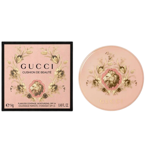 - Gucci Beauty Cushion với công thức SPF 22/PA ++, đặc tính chống ô nhiễm và chống ánh sáng xanh giúp bảo vệ da khỏi ánh nắng mặt trời và các tác nhân bên ngoài khác và tăng cường dưỡng ẩm suốt cả ngày. Công thức cũng có lipochrome, chiết xuất từ dầu hoa hồng đen mang lại vẻ tự nhiên và mịn màng cho làn da.