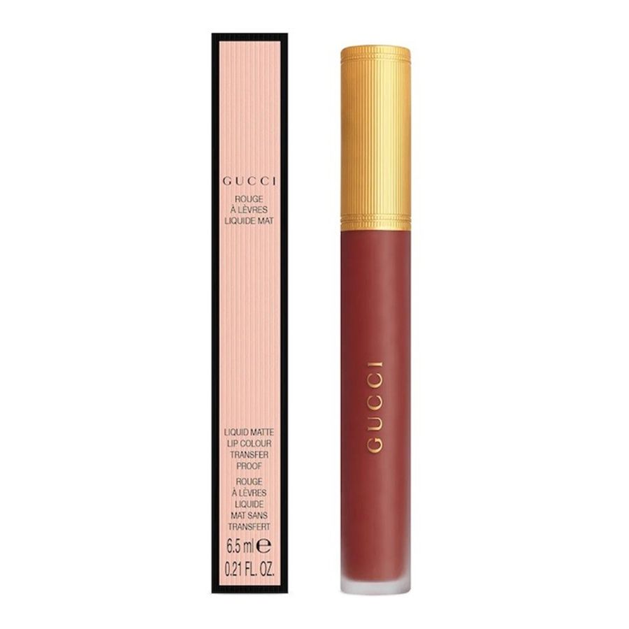 Son Gucci màu đỏ gạch là dòng son Liquid Matte tức là son kem lì. Khi đánh lên môi rất căng mọng, mướt và mịn màng vô vùng. Son dạng kem lướt nhẹ trên môi biến đổi nhanh sang dạng lì tạo một cảm giác nhẹ trên môi.
